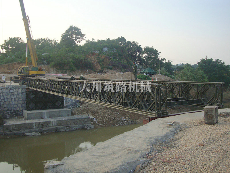 特點:本鋼橋由國防科技大學全程指導和監督安裝,滿足荷載80T施工車輛通行,因施工場地要求,采用貝雷梁組合式橋墩,安裝拆除方便,穩定性好。采用推出法安裝,安裝周期20天,于2011年5月25日通車。